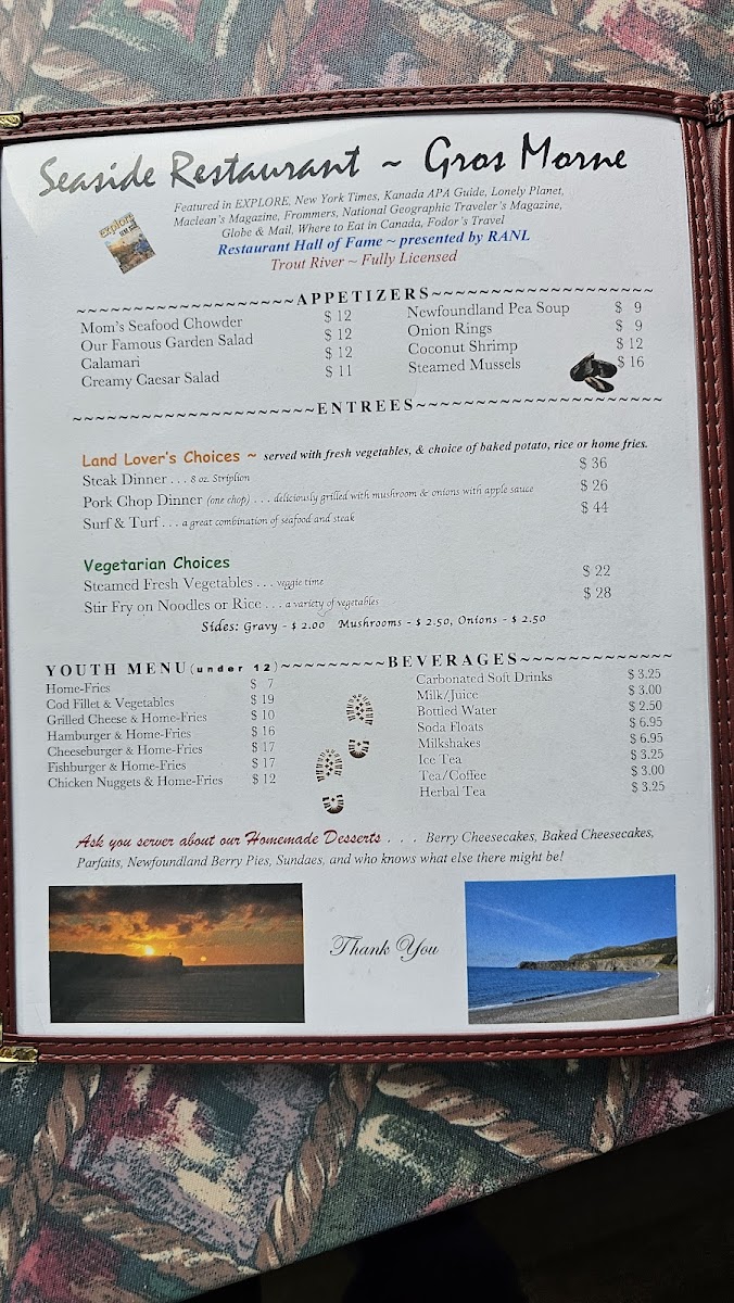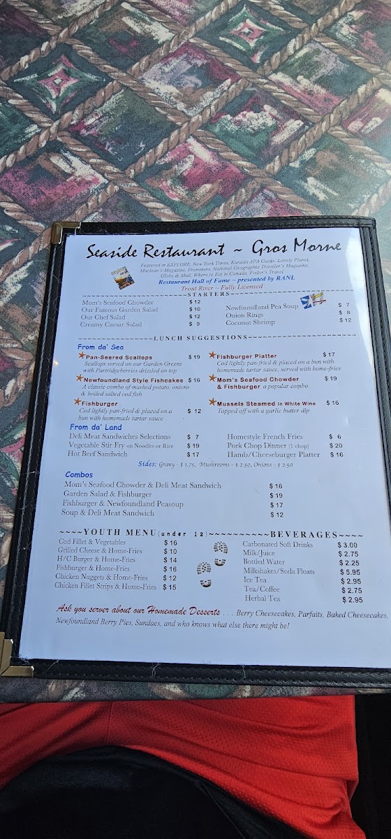 Welcome to Seaside Restaurant, a culinary gem nestled in the heart of Trout River, Newfoundland. Located at 263 Main St, this restaurant embraces the fresh flavors of coastal cuisine, offering a delectable menu that features both seafood and classic dishes. The inviting atmosphere pairs perfectly with a well-curated selection of beverages, including a variety of exquisite wines such as Villa Maria Sauvignon Blanc and Seaside Chardonnay, offering options to please every palate.
